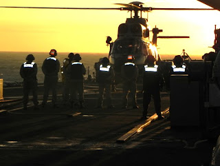 Adestramento de militares no mar, na terra e também no ar, é o que vem sendo praticado na Operação “Atlântico II”. Desta vez, foi a aeronave UH-14, “Super Puma”, o meio utilizado para o exercício de Qualificação e Requalificação de Pouso a Bordo (QRPB). Realizada no convés de vôo (Convoo) do Navio de Desembarque de Carros de Combate (NDCC) “Mattoso Maia”, a atividade aconteceu no entardecer da última segunda-feira (19). De acordo com o Oficial de lançamento e pouso do navio, Segundo-Tenente Pedro Paulo Wood da Cruz, que auxilia as aeronaves durante as manobras, exercícios como esse são pré-requisitos no currículo dos pilotos da Marinha. “Poucos militares têm o preparo para fazer essa manobra. De tempos em tempos eles precisam de um novo adestramento”. Ele acrescenta, que a dificuldade do pouso se deve ao pequeno espaço disponível nos convoos dos navios e ao balanço do mesmo, produzido pelo mar. Por segurança, faz-se necessário prender a aeronave ao convés, com cabos de aço ou correntes, e posicionar calços em suas rodas, para evitar que a mesma venha a deslizar com o movimento do navio.